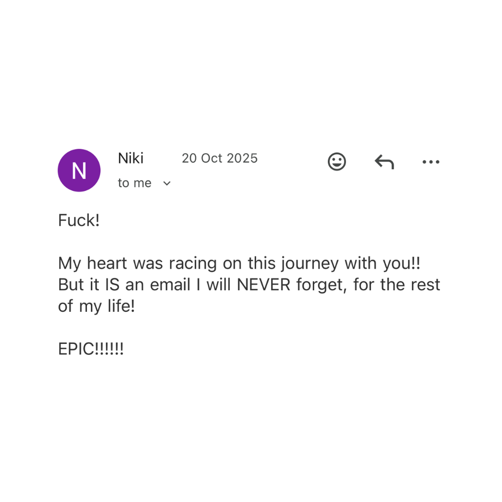 “I was feeling uninspired having to think of content to send each week, but now I have a breadth of stuff to draw on (normal, boring life!). I also love that the content can be applied to other forms of writing like Substack and Instagram. The art of storytelling is a super transferrable skill. Literally even if you wanna make people laugh at the pub — storytelling is key!”